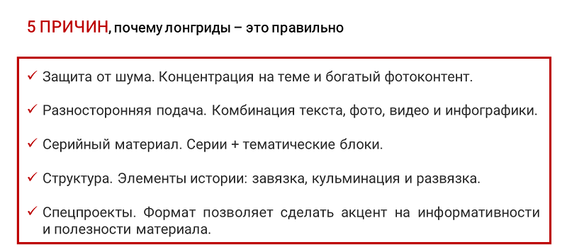 Длинная портянка текста убьет конверсию, никто ее читать не будет. Вообще текст для соцсетей должен быть коротким. Для статей допустимы разные форматы, даже лонгриды (об этом расскажем подробнее ниже). Но любой текст должен быть отформатирован: разбейте его на абзацы, оформите подзаголовки, списки - так читателю будет удобнее. Добавьте картинки по теме - об этом тоже чуть позже.