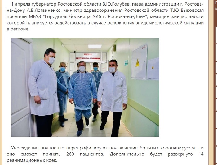 — Пациенты, обратившиеся в рабочую группу по противодействию распространению коронавирусной инфекции при полномочном представителе Президента РФ в ЮФО, указали, что с момента обнаружения коронавирусной инфекции им не оказывается должная врачебная помощь: капельницы иногда ставят волонтеры (студенты медицинских вузов), ординаторы работают без перчаток и крайне редко заходят в палаты к больным. В медицинском учреждении нарушены все антисанитарные нормы: нет одноразовой посуды; в палатах и туалетах не ведется уборка и не выносится мусор; не производится вообще какая-либо дезинфекция, — говорится в заявлении по результатам проверки, которую полпредство провело после получения жалобы. — Проверкой были установлены нарушения требования биологической безопасности, способствующие внутрибольничному инфицированию опасной вирусной инфекцией сотрудников и пациентов больницы. Так, в отделении больницы, принимающем больных пневмонией, не соблюдается цикличность заполнения палат. Штатные структуры больницы не укомплектованы. Нарушены правила изоляции инфицированных пациентов с другими больными и медицинскими сотрудниками, т.е. для изоляции условия не созданы.Также отсутствует надлежащее обеспечение медицинского персонала средствами индивидуальной защиты .Нет одноразовой посуды.