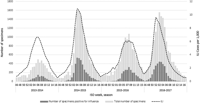 We estimated excess deaths of 7,027, 20,259, 15,801 and 24,981 attributable to influenza epidemics in the 2013/14, 2014/15, 2015/16 and 2016/17, respectively, using the Goldstein index. The average annual mortality excess rate per 100,000 ranged from 11.6 to 41.2 with most of the influenza-associated deaths per year registered among the elderly.