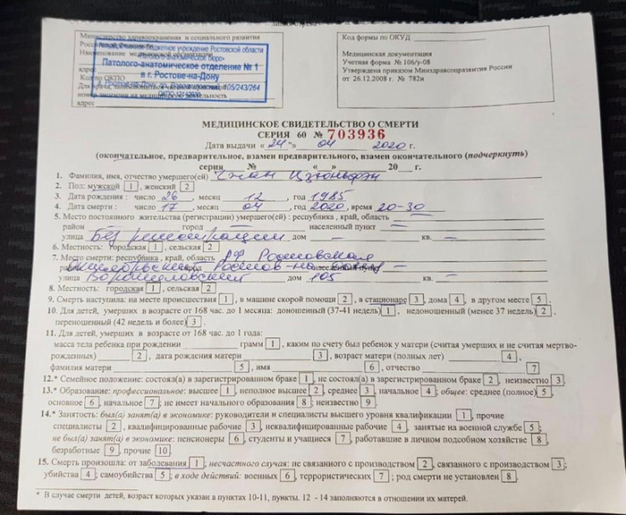 — Были сопутствующие хронические заболевания. К сожалению, здесь можно говорить и о позднем обращении за медицинской помощью, — так прокомментировали его гибель представители правительства Ростовской области.