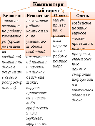 По степени воздействия выделяют неопасные вирусы, которые не мешают работе компьютера, опасные, которые могут привести к различным нарушениям в работе компьютера, и очень опасные, воздействие которых может привести к потере программ, уничтожению данных, стиранию информации в системных областях диска.