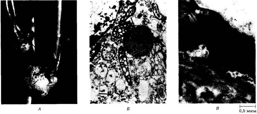 Рис. 12-8. А. Опухоли донника белого ( Melilotus alba), вызванные вирусом раневых опухолей. Б. Частицы вируса раневых опухолей (отменены стрелками) на электронной микрофотографии клетки растения-хозяина. В. Цикадка (Agallia constricta ) — переносчик вируса раневых опухолей. Электронная микрофотография эпидермальной клетки Agallia. Вверху слева видны многочисленные вирусные частицы, скопления которых напоминают соты. Внизу справа видны отдельные вирусные частицы. Вирус раневых опухолей, подобно многим вирусам растений, содержит двухцепочечную РНК