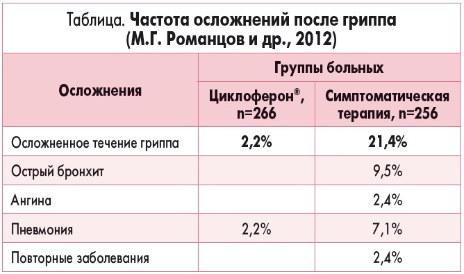 На фоне приема Циклоферона частота осложнений после перенесенного гриппа уменьшается в 20 раз (табл.).