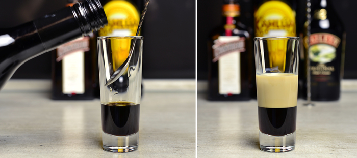 По ложке добавляем 15 мл Бейлиса (он плохо смешивается в Калуа, так что все хорошо):