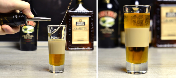 По ложке / по ножу / по стенке шота наливаем столько же бейлиса: