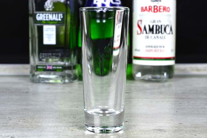 Берем таки шот и наливаем в него треть зеленого мятного ликера: