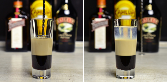 Ну и укладываем водку со сливками поверх Блю Кюрасао.