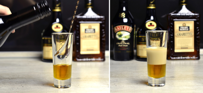 Вливаем в шот 15 мл амаретто:
