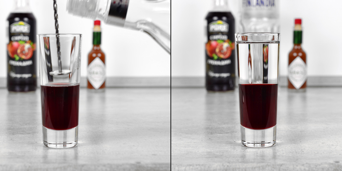 Далее отмеряем 10 мл водки, и вливаем в нее 5 мл сливок, немного перемешиваем до однородности. Можно также обойтись без сливок, верхний слой тогда будет просто прозрачным. Тоже смотрится неплохо.