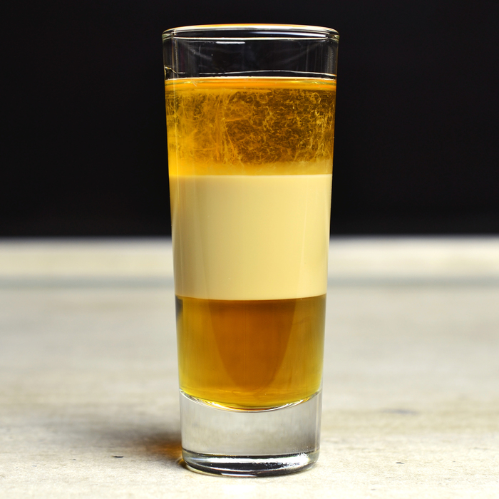 Очень симпатичный прозрачный слоистый коктейль, на вкус, как это часто бывает весьма посредственен. Вкусного в нем особо ничего нет. Сначала крепко, потом горько, и в конце уже мятно. Ну да слоистые шоты делают не для вкуса, а для красоты) Крепость коктейля, кстати, 28 процентов.