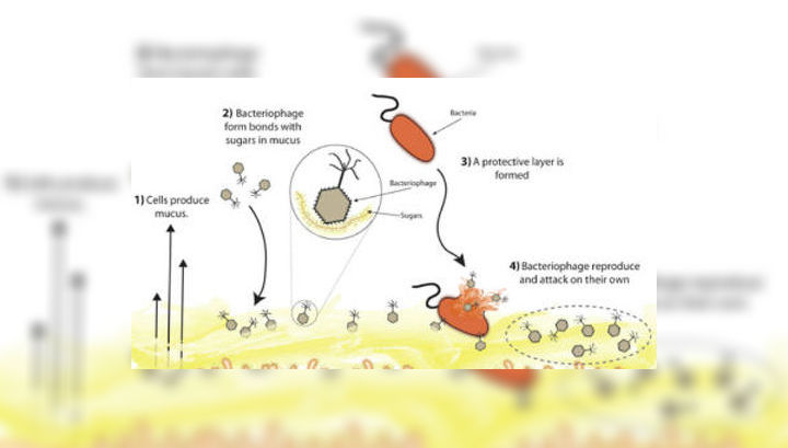 1 - клетки вырабатывают слизь, 2 – к поверхности ткани, покрытой слизью, прикрепляются бактериофаги, 3 - формируется защитный слой, 4 - бактериофаги размножаются и атакуют бактерии