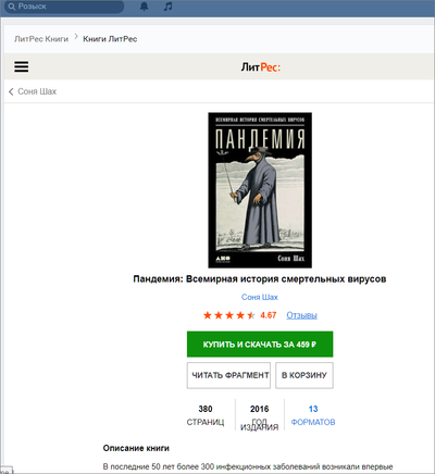 В книге "Пандемия" удостоенная профессиональных наград научная журналистка Соня Шах показывает, как она может произойти, проводя параллели между холерой - одним из наиболее опасных и страшных патогенов в мире - и новыми заболеваниями, подкарауливающими нас сегодня. Описывая этапы драматического шествия холеры - от безобидного микроба до пандемии, способной изменить мир, Шах рассказывает о патогенах, идущих за ней следом: начиная с бактерии МРЗС, поразившей ее собственную семью, до новых, невиданных прежде убийц, появляющихся на китайских продуктовых рынках, в хирургических палатах Дели, в трущобах Порт-о-Пренса и на городских окраинах Восточного побережья. Картина впечатляющая и тревожная. Книга глубоко исследует вопросы непростой науки, странной политики и запутанной истории одного из самых страшных в мире заболеваний, предостерегая о возможном будущем, которое нельзя игнорировать.