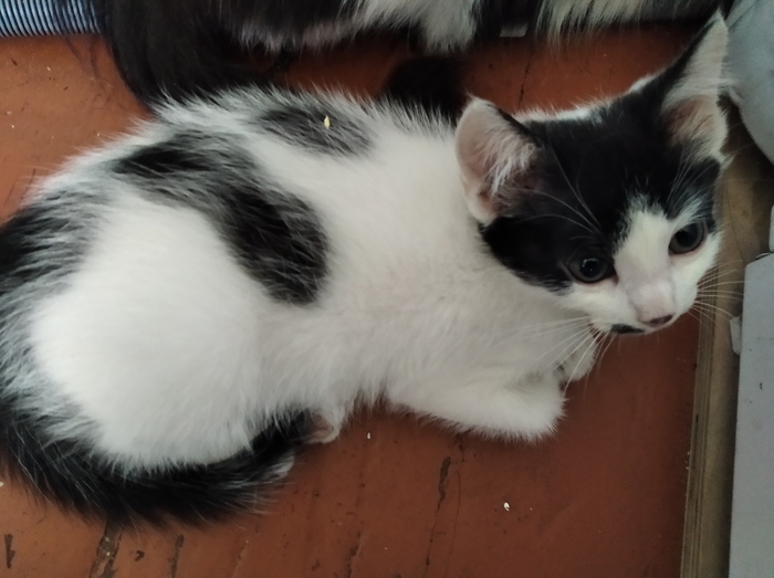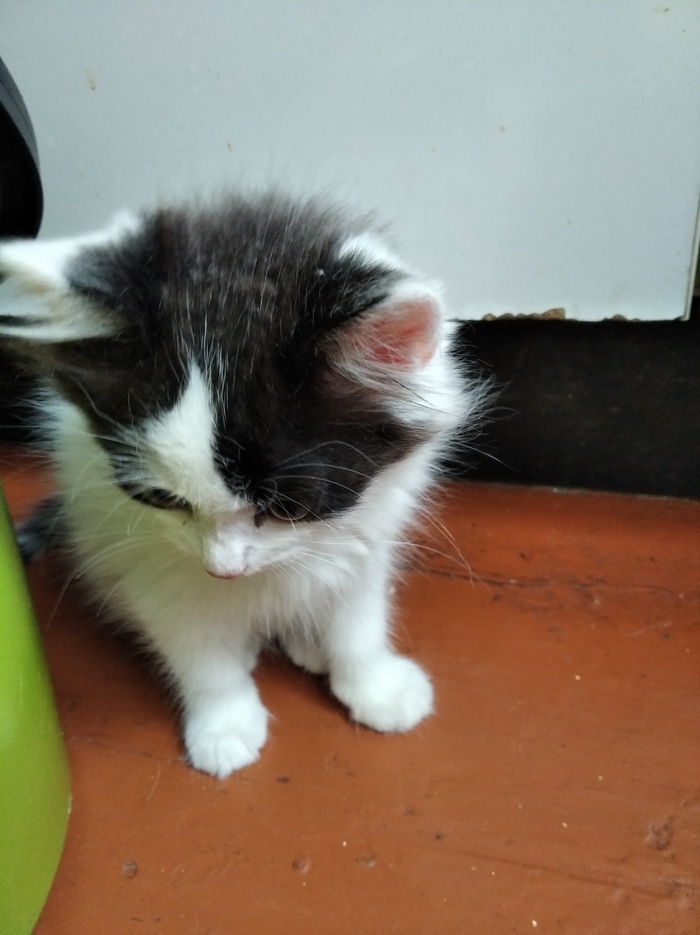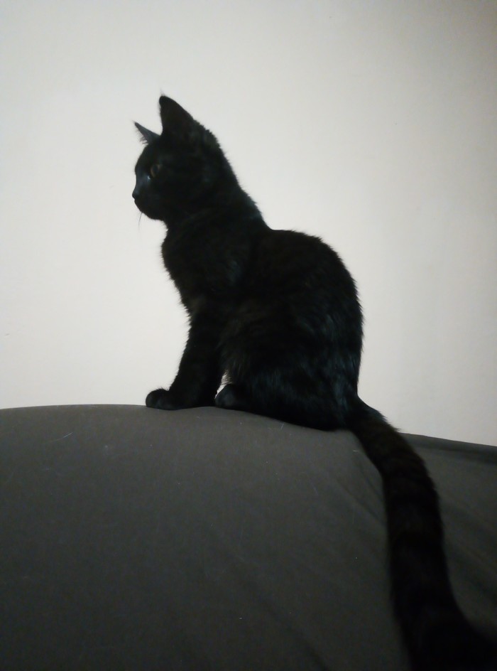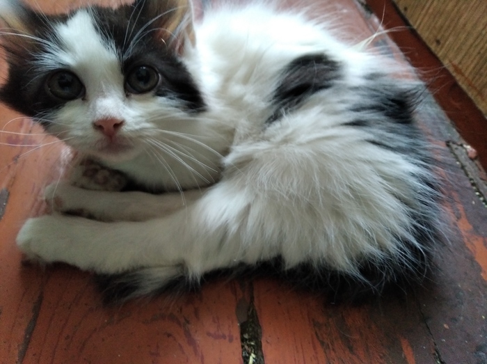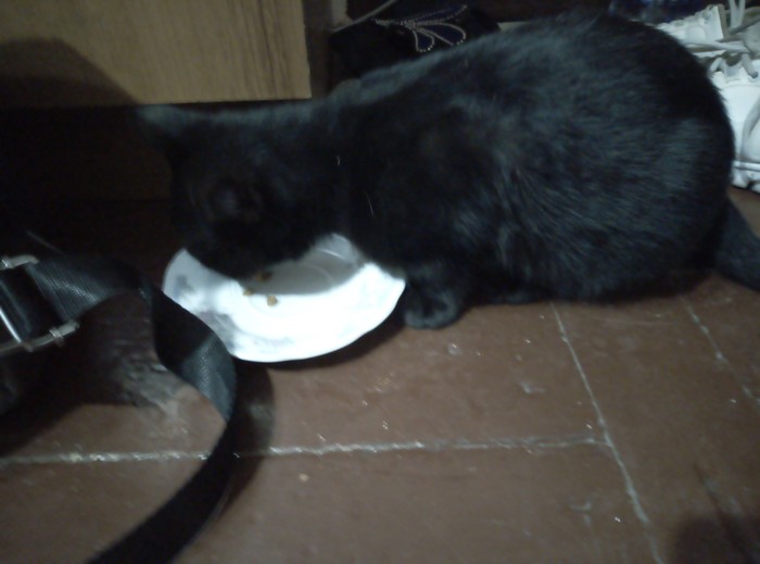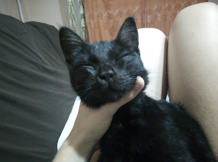 Шла домой с друзьями, под ноги кинулась тьма и мяукала во всё горло) забрала её с собой, оказалась мальчиком. Примерно 4 месяца, помыт, обработан от паразитов, с зп поедет на кастрацию. Ласкуха, мурчуха, в плане еды диковат, может сожрать руку по локоть. В лоток ещё промахивается. Моя кошка вся в меня, эгоистка и не терпит посторонних в доме, шипит и бьёт мелкого(