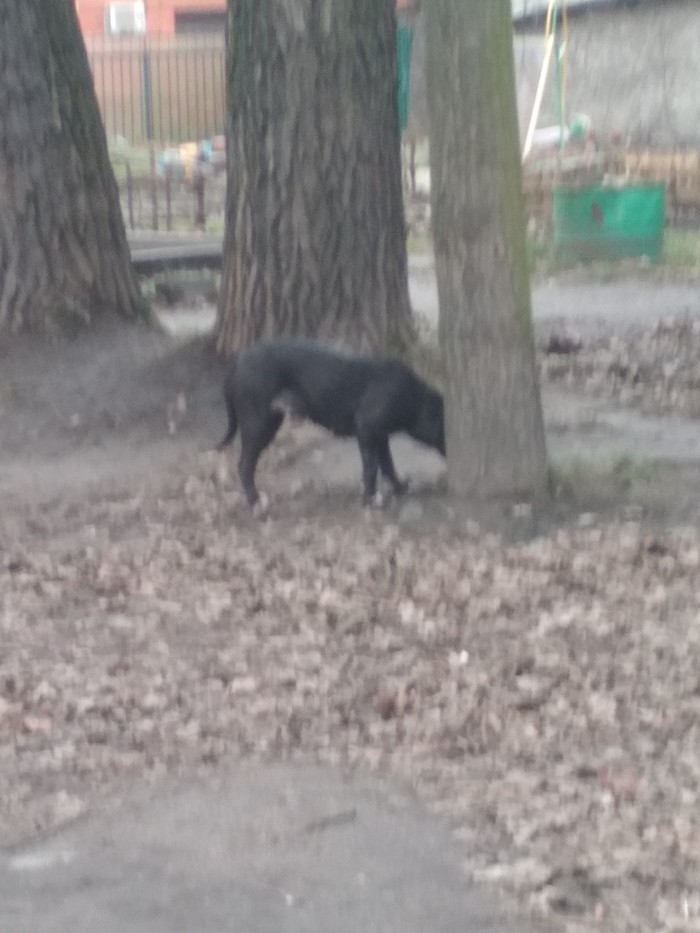 Калининград. По улице бегает собака, сука, без ошейника. Видно что потерялась, Беспокойно бегает, подбегает к людям. Возле остановки П. Морозова, Балт. Район.