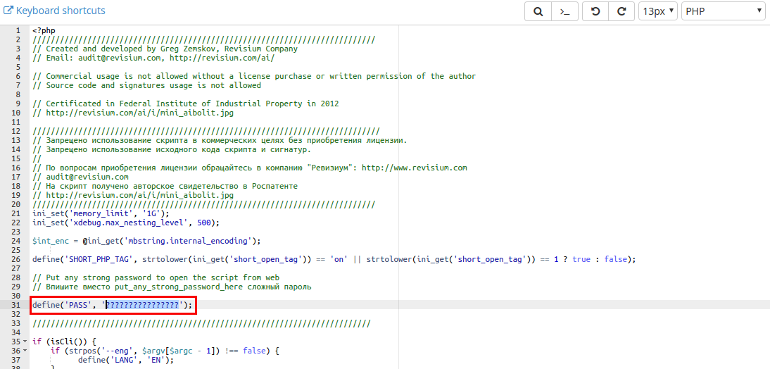 3. Далее в файле /ai-bolit/ai-bolit.php требуется установить свой пароль. Находите строку с определением пароля: