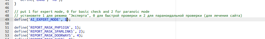 Затем найдите строку define(‘AI_EXPERT_MODE’, 1) и здесь следует указать параметр, чтобы выбрать режим сканирования.