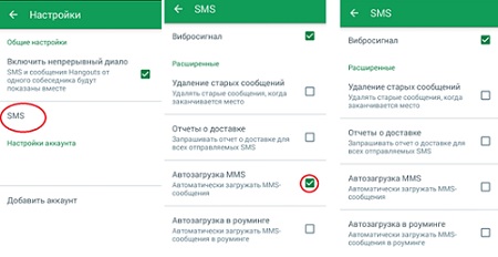 Рисунок 17. Отключение автозагрузки mms-сообщений в Hangout