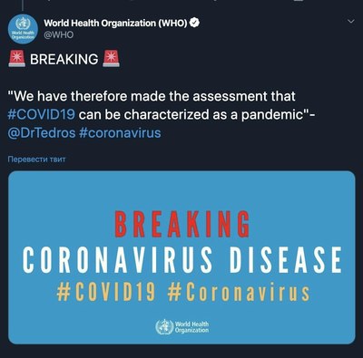 Пандемия была установлена 11 марта 2020 года, также через три месяца. Гендиректор ВОЗ Тедрос Гебреисус сообщил об этом в минувшую среду. По данным на тот день, число заразившихся во всем мире превысило 130 тыс. человек. Носители инфекции обнаружены в 112 странах и территориях.