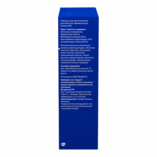 | Действующие вещества: | Аскорбиновая кислота, Фенирамин, Фенилэфрин, Парацетамол |