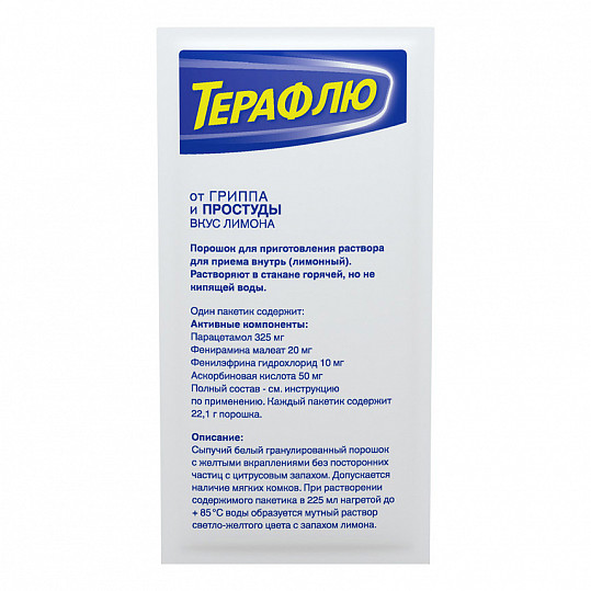 ТЕРАФЛЮ СО ВКУСОМ ЛИМОНА от гриппа и простуды - ваш компактный помощник. Предназначен для симптоматического лечения инфекционно-воспалительных заболеваний (ОРВИ, в том числе гриппа), проявлениями которых являются: