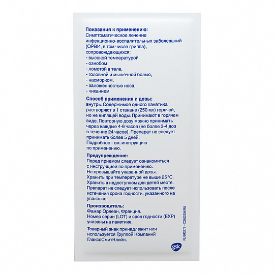 Симптоматическое лечение инфекционно-воспалительных заболеваний (ОРВИ, в т.ч. гриппа), сопровождающихся высокой температурой, ознобом, ломотой в теле, головной и мышечной болью, насморком, заложенностью носа, чиханьем.