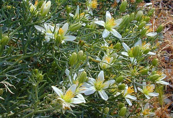Описание растения: множественные, одревесневающие с возрастом стебли до 50–65 см в высоту; голые, извилистые, зеленого цвета ветви; поочередно сидячие, дланевидно-рассеченные на несколько сегментов листья; многочисленные белые или бледно-желтые цветки, размещенные по 2-3 на верхушках зрелых стеблей и молодых ветвей, с рассеченными на 5 линейных чашелистиков чашечками; венчик состоит из 5 лепестков с 10–15 тычинками.
