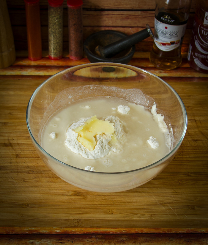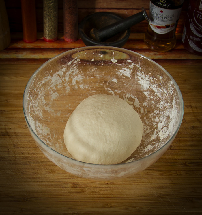 В рецепте я специально не дал точные граммовки, потому что они тут не важны. Если кажется, что тесто слишком жидкое - добавьте чуть муки, если слишком сухое - чуть воды. Идеальное тесто после замеса на ощупь напоминает очень мягкий ластик. Тесто накрываем пленкой и отправляем в холодильник отдохнуть минут на 20-30.