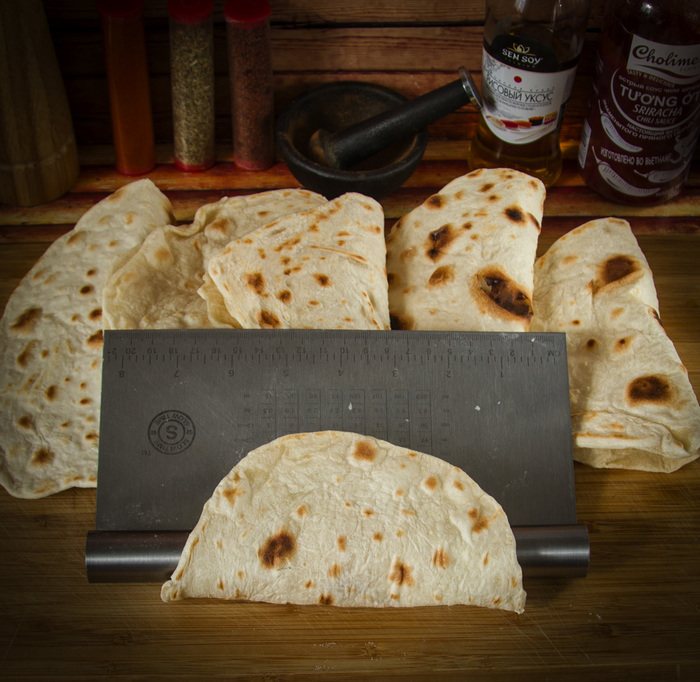 Далее разделяем тесто на кусочки, у меня это 7 штук. Далее нужно раскатать кусочки в, непосредственно, тортильи, толщиной примерно в 3 мм. Этот тот еще геморрой, у меня они никогда круглыми не получаются :)