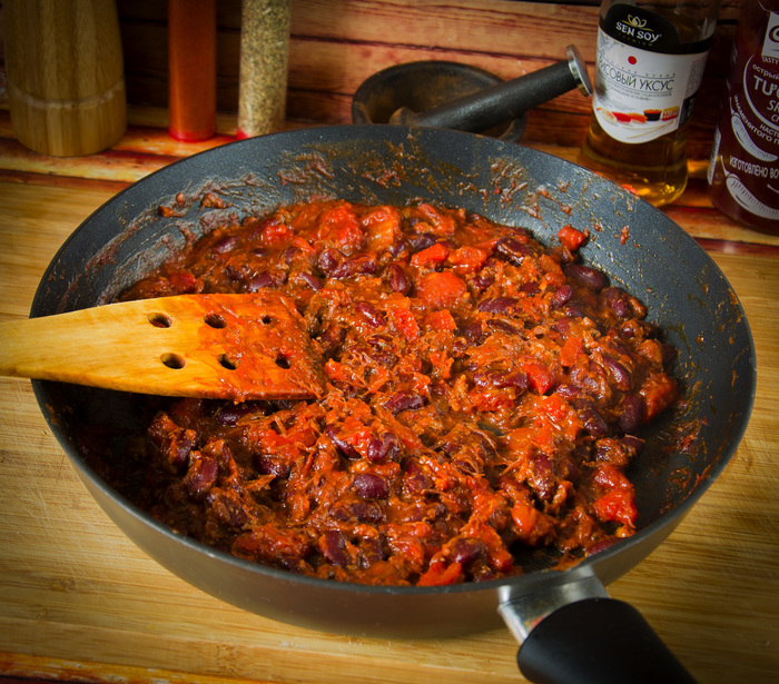 Далее добавляем фасоль без жижи из банки, но жижу не выбрасывайте, я слышал, что из неё можно безе сделать (помните, безотходное производство!) и томаты. Все перемешиваем, добавляем чуть сахара, чтобы помидоры сильно не кислили и увариваем до густоты. В принципе у нас уже получился отличный бомжечили, можно и так наворачивать :)