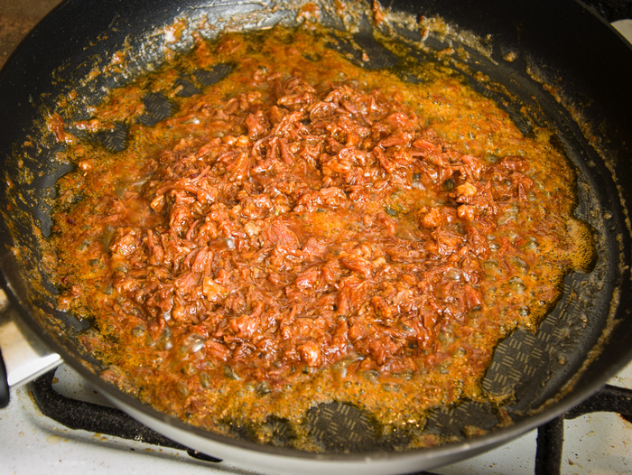 2. А теперь время начинки. В сковородку, где жарили тортильи (вы же не хотите кучу посуды мыть?) выливаем тушенку, ну то что там осталось и вывариваем до испарения всей жидкости. Добавляем специи и перемешиваем.