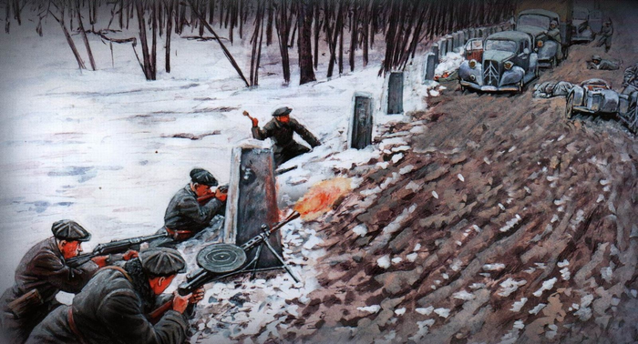 Залегли в снег в маскхалатах, пропустили колонну. Решили атаковать их на обратном пути, когда вечером поедут с охоты. 12 часов ждали в снегу, не шевелясь. И вот скоротечный бой. Немцев положили всех, забрали трофеи и документы (гауляйтера среди фрицев не оказалось). Наши без потерь — только один тяжело раненый и контуженный, командир. Неудачно бросил взрывчатку. Довоевался.