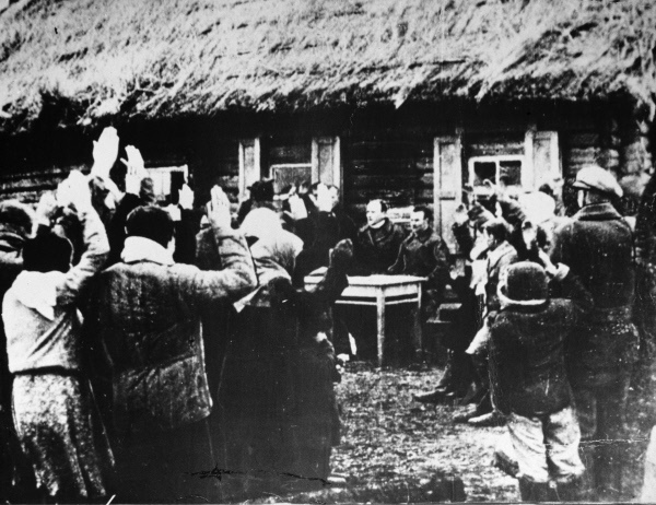 Общее собрание крестьян, голосующих за создание колхоза в Мышковичах, июль 1944-го. Фотография из музея колхоза "Рассвет
