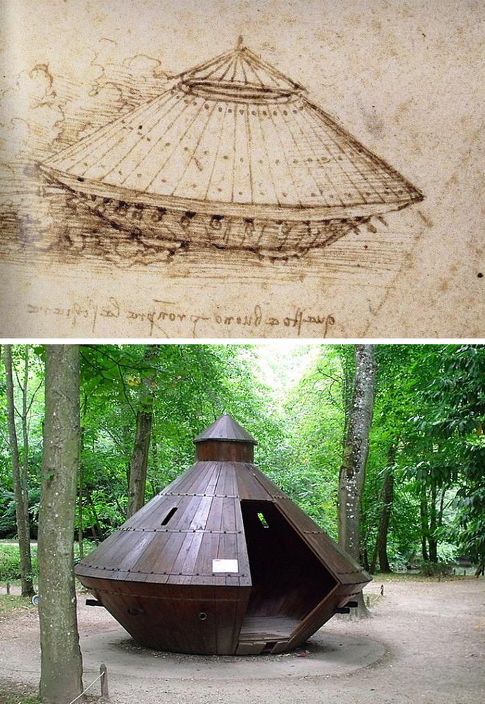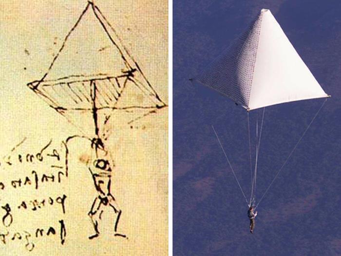 Мечта о полете всегда преследовала Леонардо да Винчи. Сначала изобретатель исследовал птиц и старался сделать машину с крыльями: человек располагался в ней лежа и крутил педали, приводя в движение крылья. Затем Леонардо стал задумываться об идее планирующего полета. Так, в его чертежах обнаружили разработку дельтаплана и парашюта.