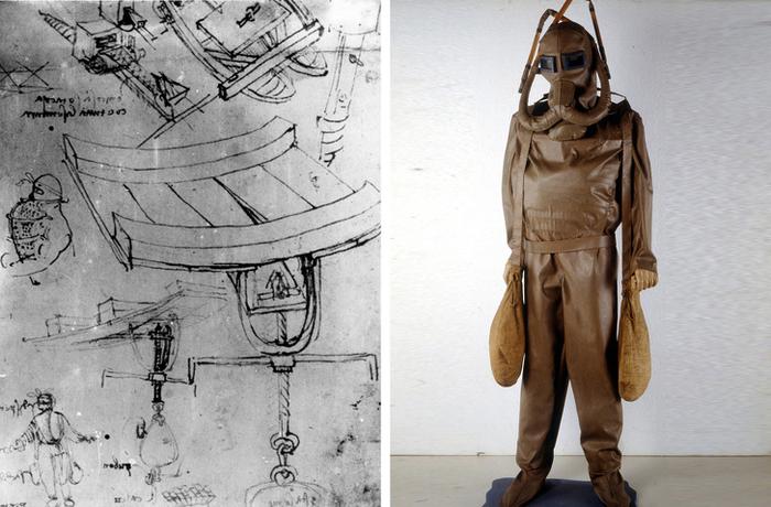 Наравне с желанием подняться в воздух да Винчи мечтал опуститься под воду. Леонардо разработал водолазный костюм. Он был сделан из свиной кожи, к нему крепился кожаный бурдюк для хранения воздуха. Инженер придумал маску со стеклами, на которой была установлена броня от хищных рыб. Да Винчи усовершенствовал и дыхательную трубку: он установил на верх пробковый круг, который не давал трубке тонуть.