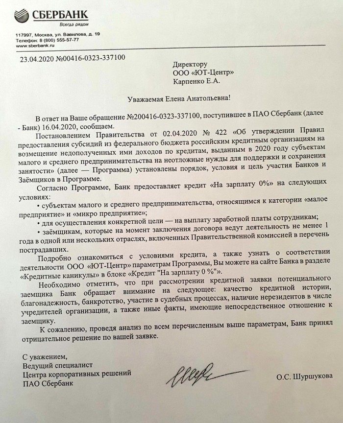 Озадачились с бухгалтером возможностью получить кредит в Сбербанке на выдачу заработной платы, широко рекламируемый такой , беспроцентный. Подали заявку.