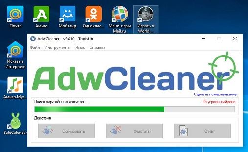 Загрузите на компьютер AdwCleaner. Этот сканер не требует установки — просто запустите: жмите Сканировать — Очистить — Перезагрузите ПК.