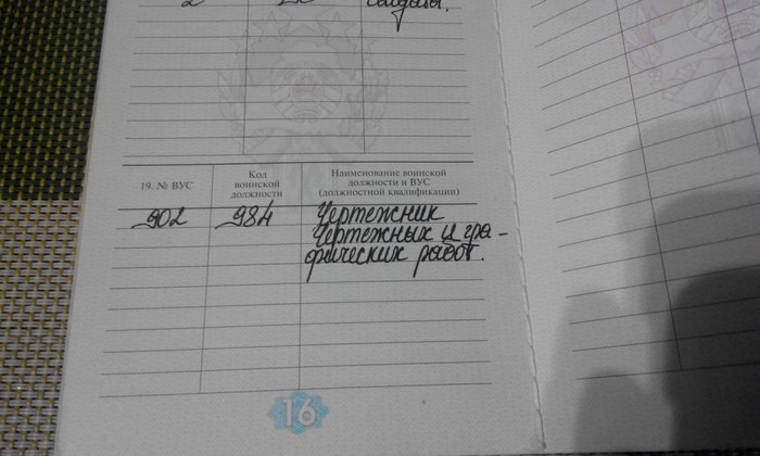 Своей недрогнувшей рукой, сотрудник военкомата вписал мою специальноть в военник, но упустил один важный момент, а именно "по ремонту". В результате получилось это: