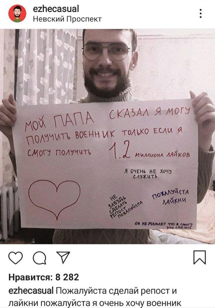 Репост до военкома дойдет и тогда он так лайкнет, что постить он будет из казармы