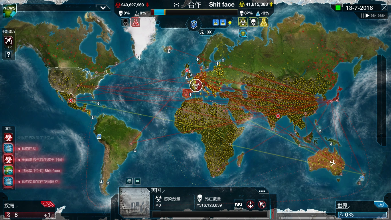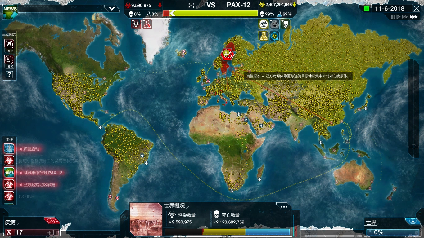 - Ускоренные исследования - Ваша болезнь "замораживается" и становится невидимой для людей в выбранной стране, а значит они переключат внимание на болезнь противника и разработка его лекарства ускорится, однако ваша болезнь в выбранной стране не может заражать или убивать до окончания способности.