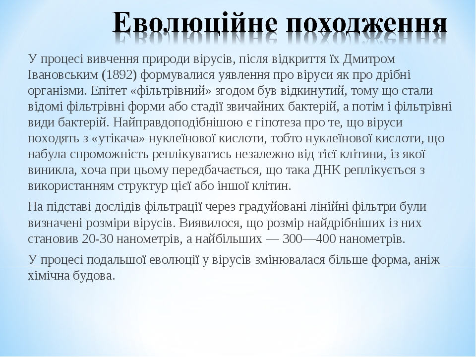 Походження вірусів. Шляхи виникнення вірусів невідомі, і тому існують різні погляди щодо їх походження. Більшість вірусологів схиляється до думки, що віруси – поліфілетична група, яка об'єднує форми життя, що мають багато подібних ознак і водночас різні за своїм походженням, тобто не мають єдиного спільного предка. Сьогодні існує три основні гіпотези походження вірусів: