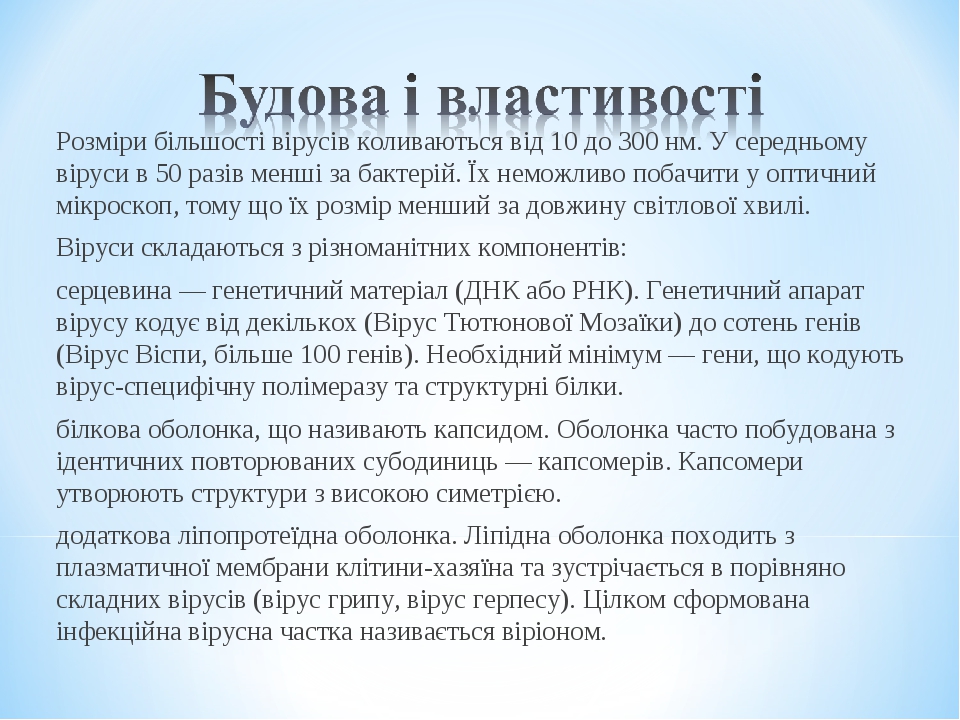 Розміри більшості вірусів коливаються від 10 до 300 нм. У середньому віруси в 50 разів менші за бактерій. Їх неможливо побачити у оптичний мікроскоп, тому що їх розмір менший за довжину світлової хвилі. Віруси складаються з різноманітних компонентів: серцевина — генетичний матеріал (ДНК або РНК). Генетичний апарат вірусу кодує від декількох (Вірус Тютюнової Мозаїки) до сотень генів (Вірус Віспи, більше 100 генів). Необхідний мінімум — гени, що кодують вірус-специфічну полімеразу та структурні білки. білкова оболонка, що називають капсидом. Оболонка часто побудована з ідентичних повторюваних субодиниць — капсомерів. Капсомери утворюють структури з високою симетрією. додаткова ліпопротеїдна оболонка. Ліпідна оболонка походить з плазматичної мембрани клітини-хазяїна та зустрічається в порівняно складних вірусів (вірус грипу, вірус герпесу). Цілком сформована інфекційна вірусна частка називається віріоном.