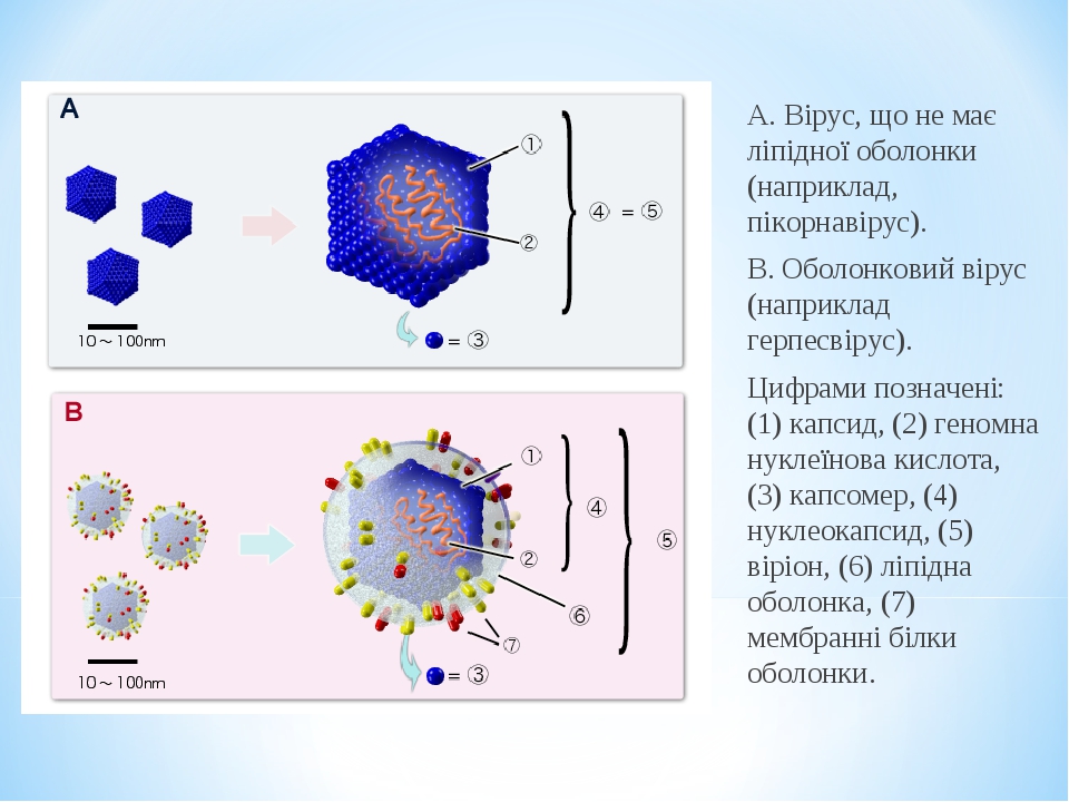 А. Вірус, що не має ліпідної оболонки (наприклад, пікорнавірус). B. Оболонковий вірус (наприклад герпесвірус). Цифрами позначені: (1) капсид, (2) геномна нуклеїнова кислота, (3) капсомер, (4) нуклеокапсид, (5) віріон, (6) ліпідна оболонка, (7) мембранні білки оболонки.