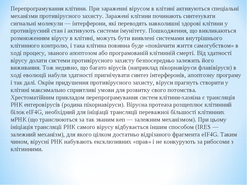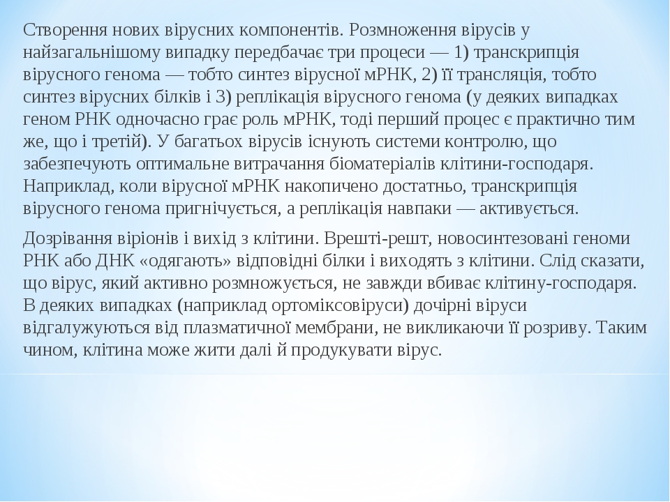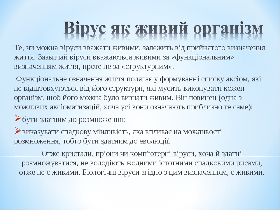 - 6. Відсутність власних білоксинтезуючих систем. Це визначає характер паразитизму вірусів – абсолютний внутрішньоклітинний паразитизм на молекулярно-генетичному рівні організації життя (віруси не можуть існувати без шкоди для клітини, хоча є й так звані непатогенні віруси, як то ендогенні віруси чи аденоасоційовані віруси).
