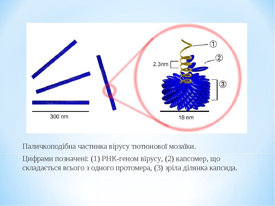 Паличкоподібна частинка вірусу тютюнової мозаїки. Цифрами позначені: (1) РНК-геном вірусу, (2) капсомер, що складається всього з одного протомера, (3) зріла ділянка капсида.