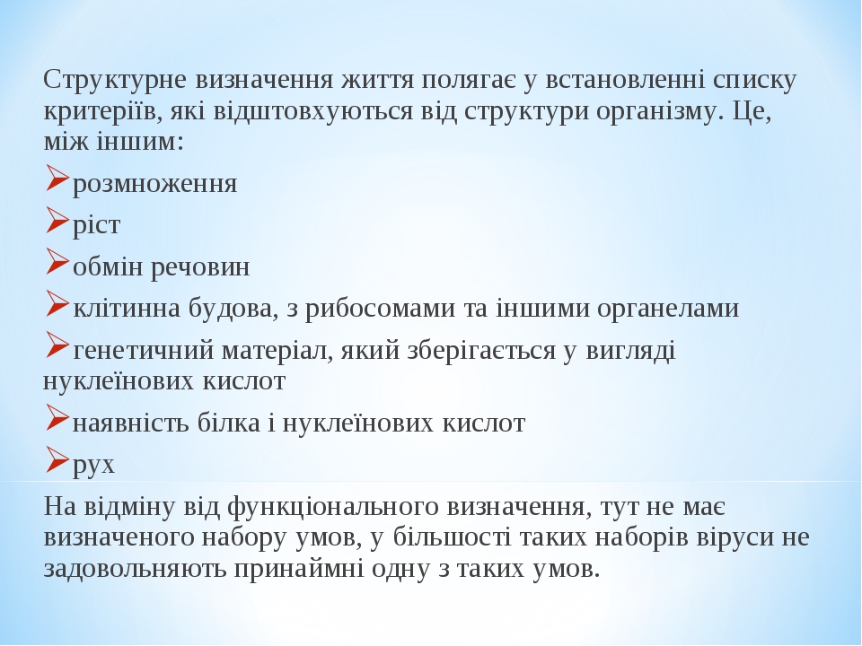 На відміну від функціонального визначення, тут не має визначеного набору умов, у більшості таких наборів віруси не задовольняють принаймні одну з таких умов.