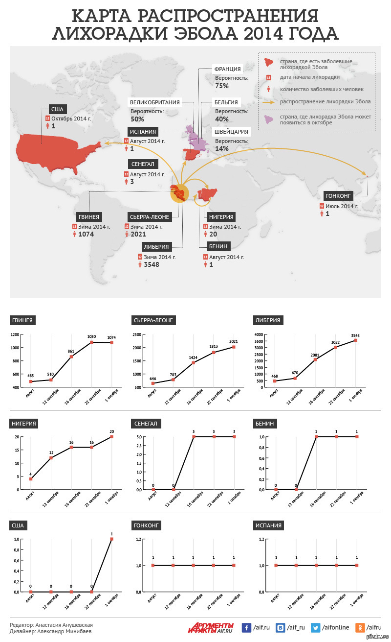 Где? Западная Африка: Конго, Южный Судан, Сьерра-Леоне, Либерия, Гвинея, Габон, Руанда, Бурунди, Мали, Нигерия, Уганда, по одному случаю в Испании, Италии, Великобритании, в США — четыре.