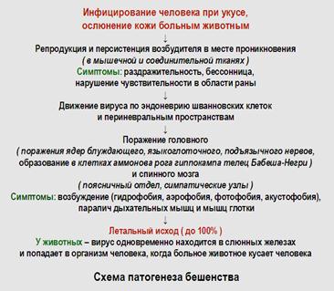 Патогенные биологические агенты проникают в макроорганизм через рану, образовавшуюся в результате укуса животного. В месте внедрения происходит первичная репликация микробов. Сначала поражаются мягкие ткани вокруг раны, а затем нервные волокна. По ним вирусы направляются в церебральные и спинномозговые структуры. Гематогенный и лимфогенный пути диссеминации возбудителя не играют существенной роли в развитии патологии. Вирусы взаимодействуют с нейромедиаторами, осуществляющими нервно-мышечную передачу, повышая возбудимость нейронов, а затем вызывая их паралич. Этот механизм лежит в основе патогенеза болезни.