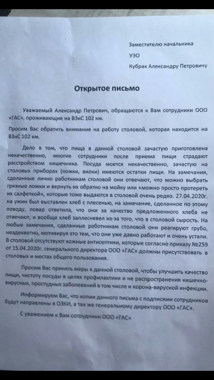 смысл писать письма на начальника УЭО? Оставьте человека в покое! Он сам а таком же положении, как и все рабочие. Пишите письма в Роспотребнадзор и прочие инстанции, жалуетесь на них самих, это ведь они удерживают вахтовиков на месторождении своими распоряжениями, а не руководство организации. Думаете руководству выгодна вся эта ситуация? хватит этих придирок за еду и столовую, а то начинаете за вирус , а заканчиваете не пойми чем!