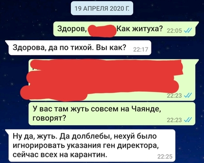 Напоминаю что мы находимся на Чаяндинском месторождении, Республика Саха a.k.a Якутия, вахтовый городок, 149й километр. Карантин. Второй день хожу к медику. Вчера температура была только в районе 37°, сегодня уже 39°. Я переживаю за своё состояние. На нервах позволил себе грубость, просто я в таком состоянии СЕГОДНЯ четвёртый раз к нему захожу покачиваясь. На четвёртый раз его застал-таки, мило беседующего о "важных" проблемах. Прежде заглянул и спокойным тоном спросил могут ли меня принять, какого рода у них беседа, критическая ли ситуация. Смиренно ждал у входа на улице несколько минут! А после этого сами видите что. НЕТ, ОКАЗЫВАЕТСЯ НЕ ВИДИТЕ. НЕ МОГУ ЗАГРУЗИТЬ ВИДЕО, ПОПРОБУЮ В КОММЕНТАХ.