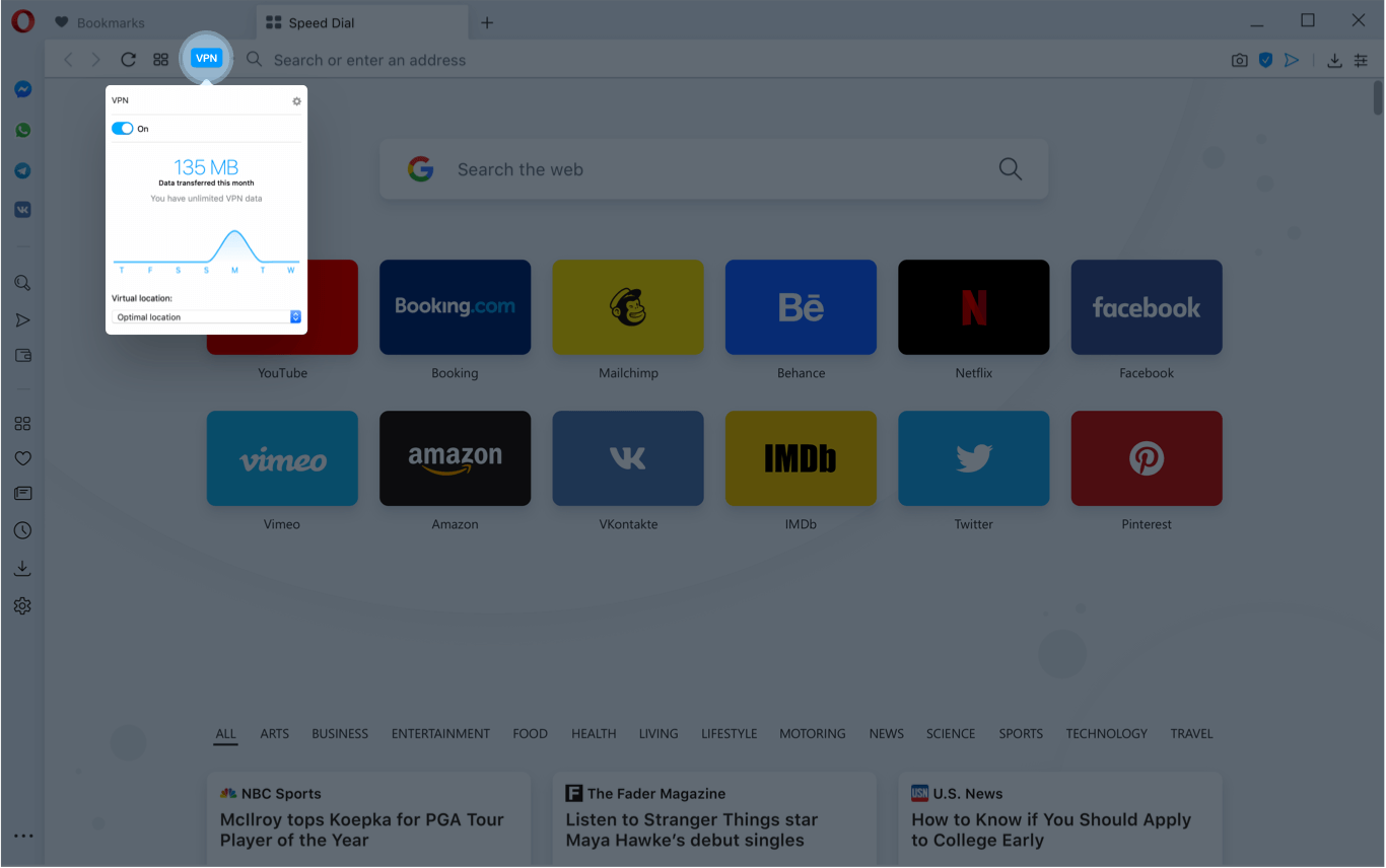 Безопасная сеть VPN браузера может быть лишней дома, но ее рекомендуется использовать при подключении к общественной сети Wi-Fi. Подключение к веб-страницам через Opera VPN (виртуальная частная сеть) значит, что данные, обмен которыми выполняется, зашифрованы и передаются отдаленным сервером. Шифрование помогает обезопасить ваши данные от любопытных взглядов, тогда как удаленный сервер скрывает ваш IP-адрес и местонахождение для большей конфиденциальности. Никакие расширения не требуются для безопасного браузера.